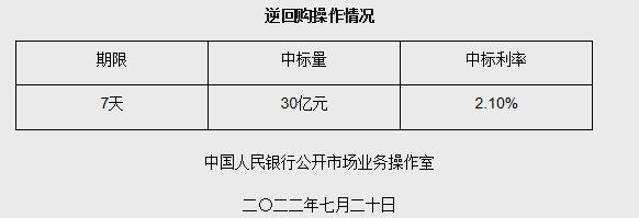 为维护银行体系流动性合理充裕,2022年7月20日人民银行以利率招标方式开展了30亿元逆回购操作。具体情况如下: