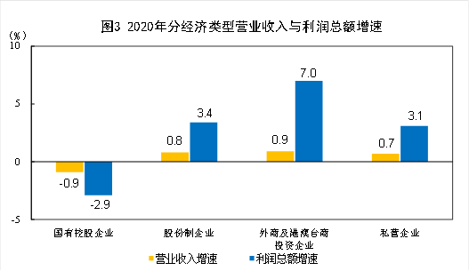 2020年,规模以上工业企业中,国有控股企业实现利润总额14860.8亿元,比上年下降2.9%;股份制企业实现利润总额45445.3亿元,增长3.4%;外商及港澳台商投资企业实现利润总额18234.1亿元,增长7.0%;私营企业实现利润总额20261.8亿元,增长3.1%。