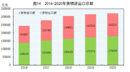 全年货物运输总量[24]463亿吨,货物运输周转量196618亿吨公里。全年港口完成货物吞吐量145亿吨,比上年增长4.3%,其中外贸货物吞吐量45亿吨,增长4.0%。港口集装箱吞吐量26430万标准箱,增长1.2%。