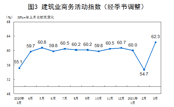 分行业看,建筑业商务活动指数为62.3%,高于上月7.6个百分点。服务业商务活动指数为55.2%,高于上月4.4个百分点。从行业情况看,调查的21个服务业行业商务活动指数均高于临界点,其中铁路运输、航空运输、电信广播电视卫星传输服务、互联网软件及信息技术服务、货币金融服务、保险等行业商务活动指数位于60.0%以上高位景气区间。