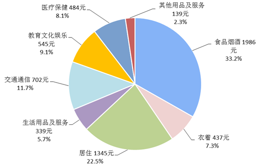 一季度,全国居民人均食品烟酒消费支出1986元,增长16.3%,占人均消费支出的比重为33.2%;人均衣着消费支出437元,增长18.4%,占人均消费支出的比重为7.3%;人均居住消费支出1345元,增长8.7%,占人均消费支出的比重为22.5%;人均生活用品及服务消费支出339元,增长19.9%,占人均消费支出的比重为5.7%;人均交通通信消费支出702元,增长16.0%,占人均消费支出的比重为11.7%;人均教育文化娱乐消费支出545元,增长55.7%,占人均消费支出的比重为9.1%;人均医疗保健消费支出484元,增长16.1%,占人均消费支出的比重为8.1%;人均其他用品及服务消费支出139元,增长24.2%,占人均消费支出的比重为2.3%。