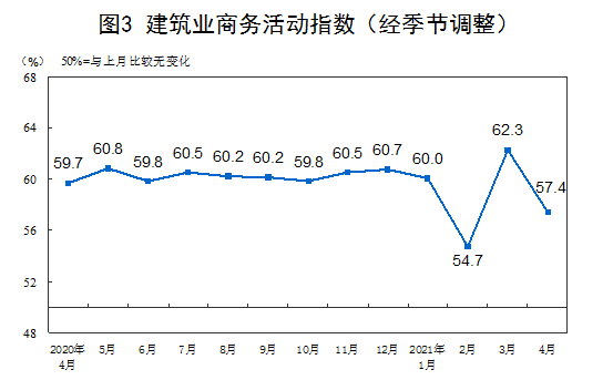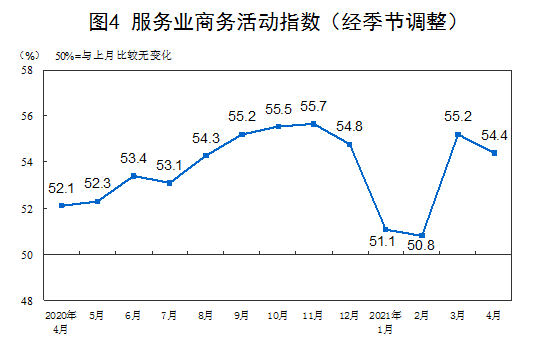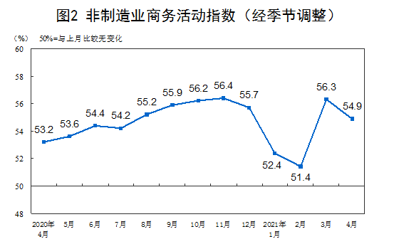 4月份,非制造业商务活动指数为54.9%,较上月回落1.4个百分点,非制造业扩张步伐有所放缓。