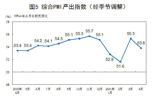 4月份,综合PMI产出指数为53.8%,比上月回落1.5个百分点,表明我国企业生产经营活动总体扩张力度减弱。