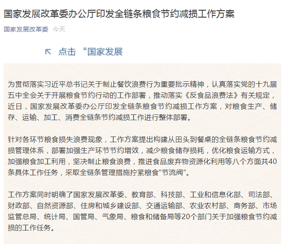 5月28日讯,近日,国家发展改革委办公厅印发全链条粮食节约减损工作方案,对粮食生产、储存、运输、加工、消费全链条节约减损工作进行整体部署。针对各环节粮食损失浪费现象,工作方案提出构建从田头到餐桌的全链条粮食节约减损管理体系,部署加强生产环节节约增效,减少粮食储存损耗,优化粮食运输方式,加强粮食加工利用,坚决制止粮食浪费,推进食品废弃物资源化利用等八个方面共40条具体工作任务,采取全链条管理措施拧紧粮食“节流阀”。