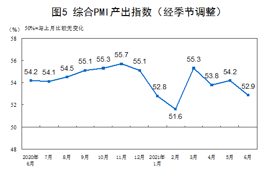 6月份,综合PMI产出指数为52.9%,比上月回落1.3个百分点,表明我国企业生产经营活动总体扩张步伐有所放缓。
