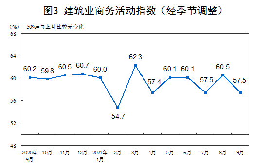 分行业看,建筑业商务活动指数为57.5%,低于上月3.0个百分点。服务业商务活动指数为52.4%,高于上月7.2个百分点。从行业情况看,铁路运输、航空运输、住宿、电信广播电视及卫星传输服务等行业商务活动指数位于60.0%以上高位景气区间;资本市场服务、房地产等行业商务活动指数低于临界点。