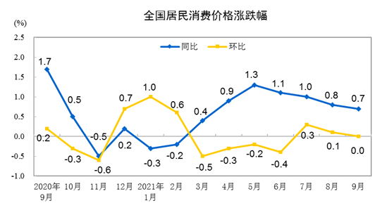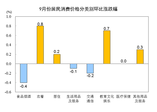 9月份,全国居民消费价格环比持平。其中,城市持平,农村上涨0.1%;食品价格下降0.7%,非食品价格上涨0.2%;消费品价格持平,服务价格上涨0.1%。