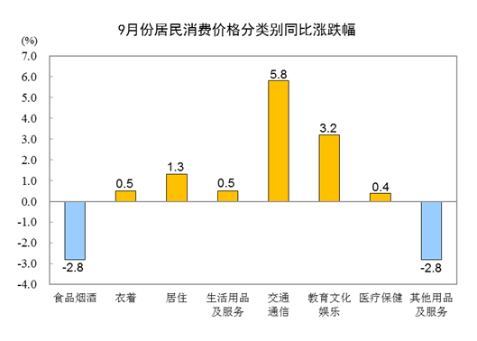 9月份,食品烟酒类价格同比下降2.8%,影响CPI(居民消费价格指数)下降约0.79个百分点。食品中,畜肉类价格下降28.5%,影响CPI下降约1.26个百分点,其中猪肉价格下降46.9%,影响CPI下降约1.12个百分点;鲜菜价格下降2.5%,影响CPI下降约0.05个百分点;鲜果价格下降0.8%,影响CPI下降约0.01个百分点;蛋类价格上涨12.6%,影响CPI上涨约0.08个百分点;水产品价格上涨9.8%,影响CPI上涨约0.18个百分点;粮食价格上涨0.7%,影响CPI上涨约0.01个百分点。