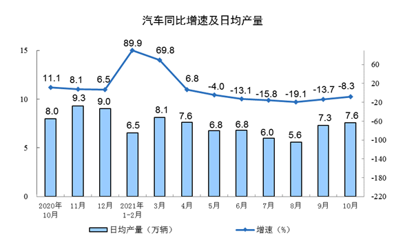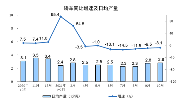 | 其中:轿车(万辆) | 87.6 | -8.1 | 765.5 | 7.6 |