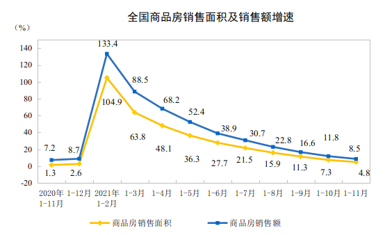 1—11月份,商品房销售面积158131万平方米,同比增长4.8%;比2019年1—11月份增长6.2%,两年平均增长3.1%。其中,住宅销售面积增长4.4%,办公楼销售面积增长2.0%,商业营业用房销售面积下降2.6%。商品房销售额161667亿元,增长8.5%;比2019年1—11月份增长16.3%,两年平均增长7.8%。其中,住宅销售额增长9.3%,办公楼销售额下降3.0%,商业营业用房销售额下降2.2%。