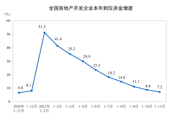 1—11月份,房地产开发企业到位资金183362亿元,同比增长7.2%;比2019年1—11月份增长14.2%,两年平均增长6.9%。其中,国内贷款21640亿元,下降10.8%;利用外资90亿元,下降41.7%;自筹资金59378亿元,增长4.8%;定金及预收款67156亿元,增长17.0%;个人按揭贷款29633亿元,增长9.8%。