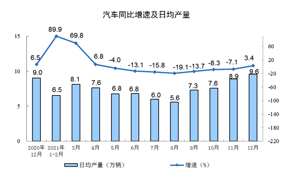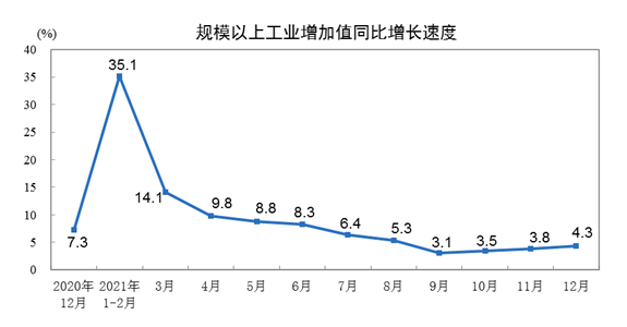2021年12月份,规模以上工业增加值同比实际增长4.3%(以下增加值增速均为扣除价格因素的实际增长率),比2019年同期增长11.9%,两年平均增长5.8%。从环比看,12月份,规模以上工业增加值比上月增长0.42%。2021年,规模以上工业增加值比上年增长9.6%,两年平均增长6.1%。