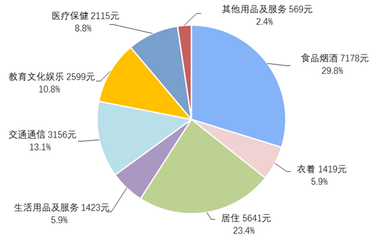 2021年,全国居民人均食品烟酒消费支出7178元,增长12.2%,占人均消费支出的比重为29.8%;人均衣着消费支出1419元,增长14.6%,占人均消费支出的比重为5.9%;人均居住消费支出5641元,增长8.2%,占人均消费支出的比重为23.4%;人均生活用品及服务消费支出1423元,增长13.0%,占人均消费支出的比重为5.9%;人均交通通信消费支出3156元,增长14.3%,占人均消费支出的比重为13.1%;人均教育文化娱乐消费支出2599元,增长27.9%,占人均消费支出的比重为10.8%;人均医疗保健消费支出2115元,增长14.8%,占人均消费支出的比重为8.8%;人均其他用品及服务消费支出569元,增长23.2%,占人均消费支出的比重为2.4%。