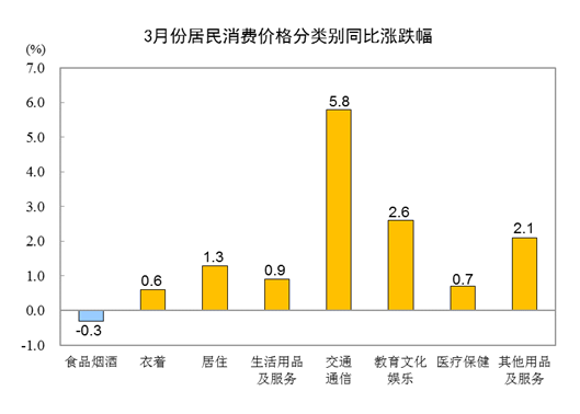 其他七大类价格同比均上涨。其中,交通通信、教育文化娱乐、其他用品及服务价格分别上涨5.8%、2.6%和2.1%,居住、生活用品及服务价格分别上涨1.3%和0.9%,医疗保健、衣着价格分别上涨0.7%和0.6%。