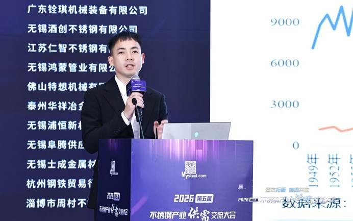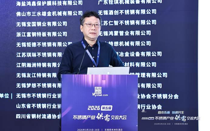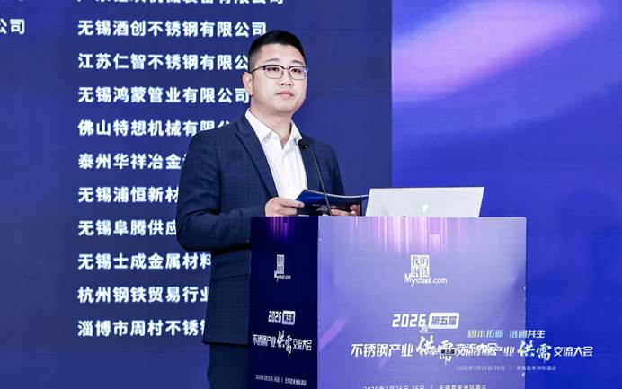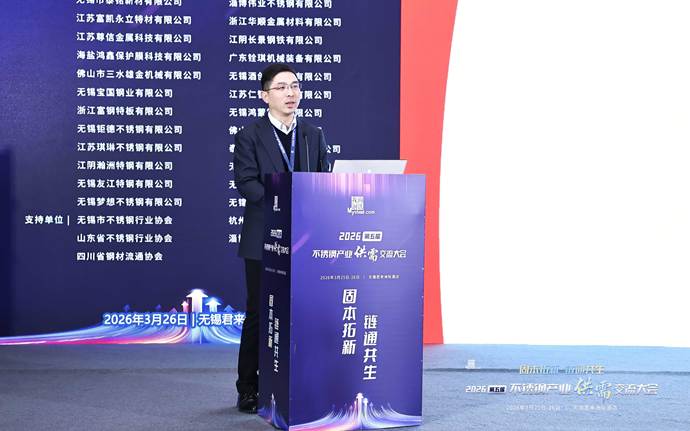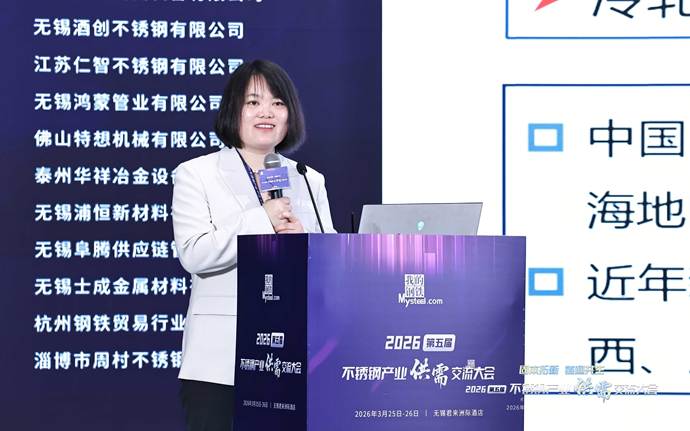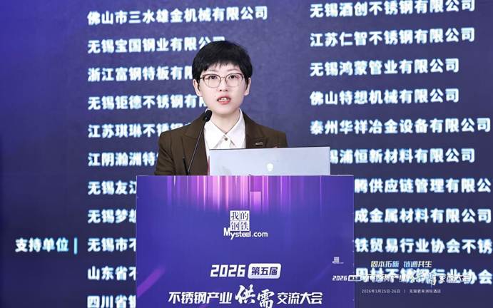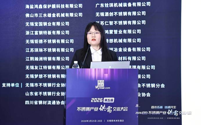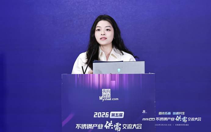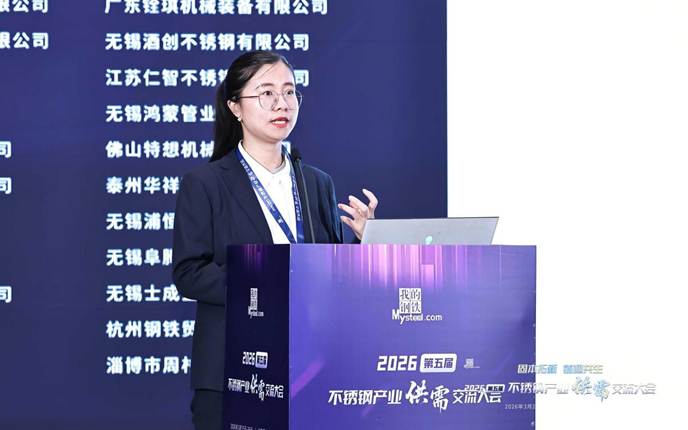 上海钢联电子商务股份有限公司不锈钢事业部分析师孙莉清发表了题为《失衡与重构—全球及中国不锈钢市场供需格局与价格走势前瞻》的主题演讲。她指出,当前全球市场进入地缘主导、政策扰动、成本抬升的新失衡阶段,宏观因素成为定价核心。印尼镍矿配额大幅下调、审批偏慢加剧供应紧张,中东地缘局势紧张导致我国对区域不锈钢出口下滑,航运受阻推升物流成本,海外贸易壁垒高筑,欧盟碳关税落地、多国对我国不锈钢加征关税,出口阻力显著加大。她认为,中国不锈钢产量、消费量占全球比重较大,行业供需双增但结构分化,高端制造、新能源需求稳健,传统领域复苏偏慢。当前行业正处于成本、政策、需求三重底部共振阶段,原料高位运行形成强支撑,产业进入规范化重构期。展望2026年,不锈钢市场以震荡修复为主,短期成本支撑强劲,中期随需求复苏、出口结构优化,价格重心稳步上移,成本决定下限,需求与出口决定上行空间。