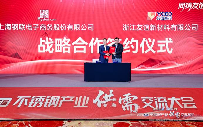 致辞环节结束后,上海钢联电子商务股份有限公司与浙江友谊新材料有限公司在现场举行了战略合作签约仪式,双方将在不锈钢产业链信息、数据服务等领域深化合作,携手推动产业高质量发展。