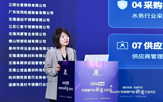 中国水务投资集团有限公司供应链服务公司总经理孙云霞发表了题为《新形势下水务行业不锈钢采购成本价格监控与采购策略简析》的主题演讲。她指出,不锈钢凭借性能与成本双优,在水厂、管网、泵站等核心环节广泛应用304、316L及双相钢等高品质材质,国家推进供排水提质、管网更新及二次供水强制标准,为不锈钢应用提供了坚实的政策支撑。她分析,不锈钢原材料成本占比70%-80%,当前市场处于震荡调整期,成本端强力支撑与高库存压力博弈,采购成本易上难下。针对价格波动大、选型不精准、采购分散、交期不稳、管控缺失五大痛点,她提出搭建数字化价格监控体系,实现四色预警与窗口期决策支持;在采购策略上,推行精准选材标准化、长协锁价与套期保值、集中采购与框架协议、规范流程管理四大举措,以建监控、定策略、强集采、锁价格、控风险五维发力,推动水务不锈钢采购实现稳供应、控成本、保安全、提效益的高质量转型。